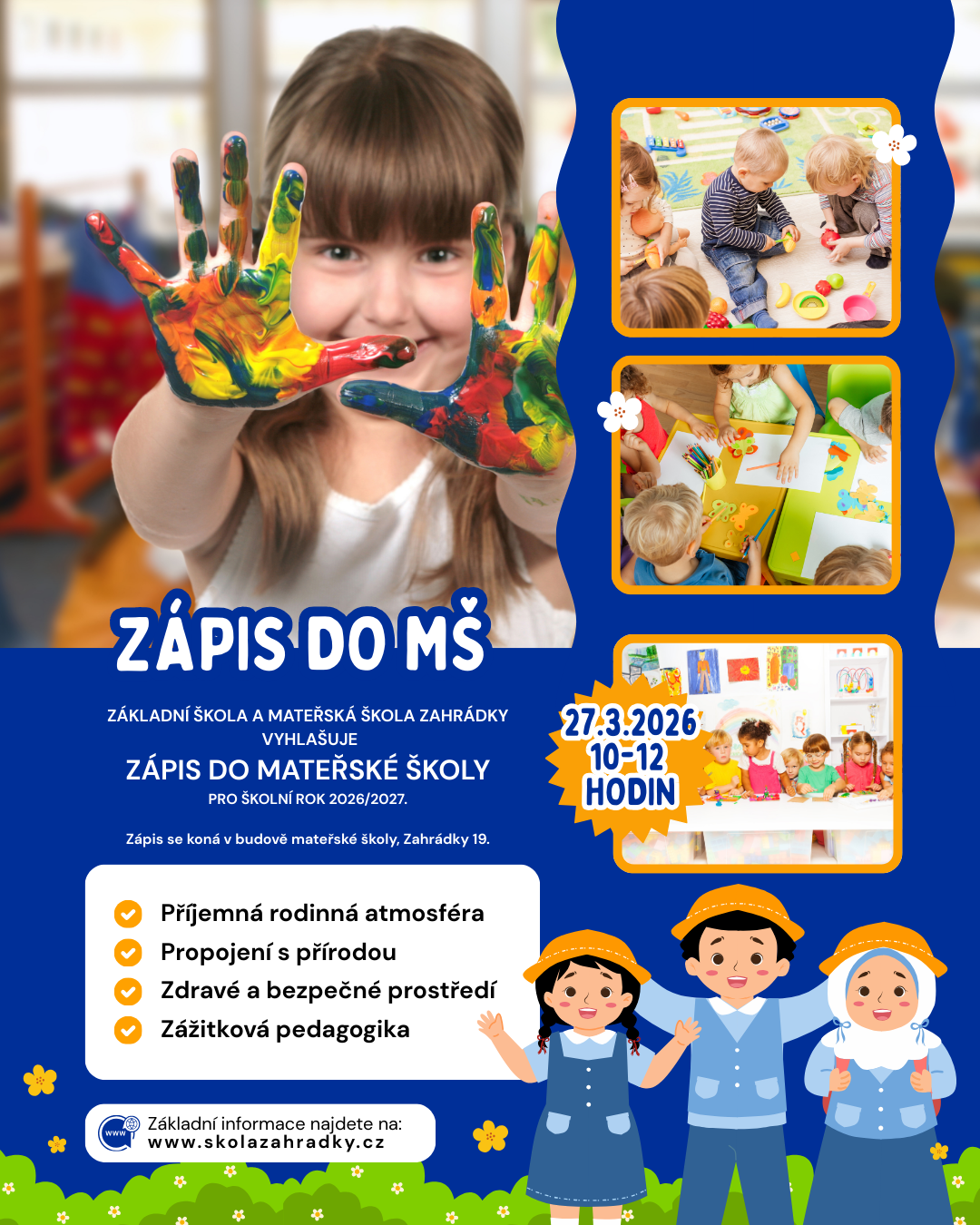 Dne 27.3.2026 mezi 10-12 hodinou bude v budově školy probíhat zápis do MŠ. Přijďte se k nám podívat.